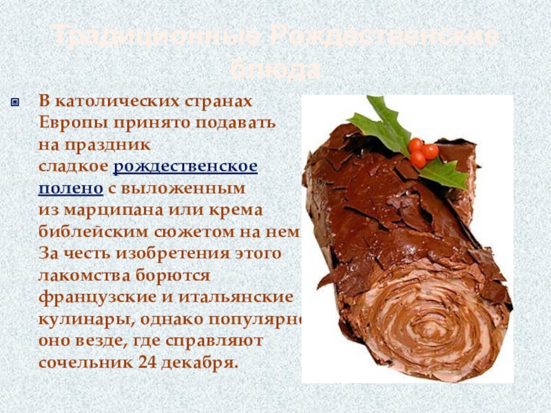 или крема библейским сюжетом на нем. За честь изобретения этого лакомства борются французские и итальянские кулинары, однако популярно оно везде, где справляют сочельник 24 декабря.