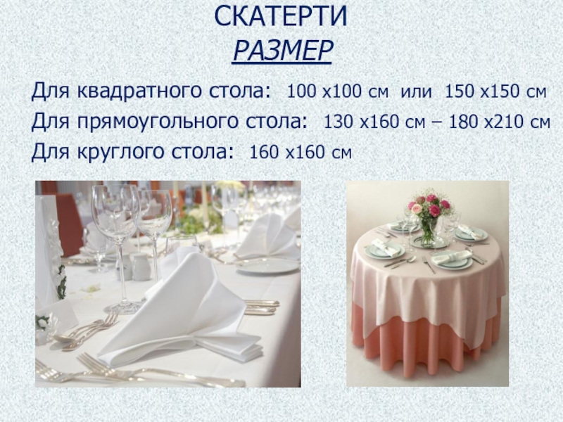 Для квадратного стола: 100 х100 см или 150 х150 см