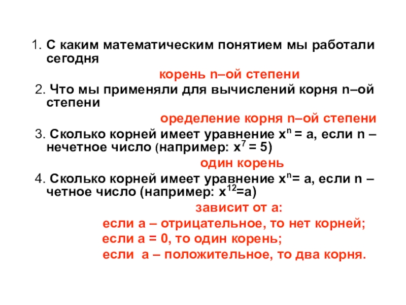 3. Сколько корней имеет уравнение хn = а, если n – нечетное число (например: х7 = 5)