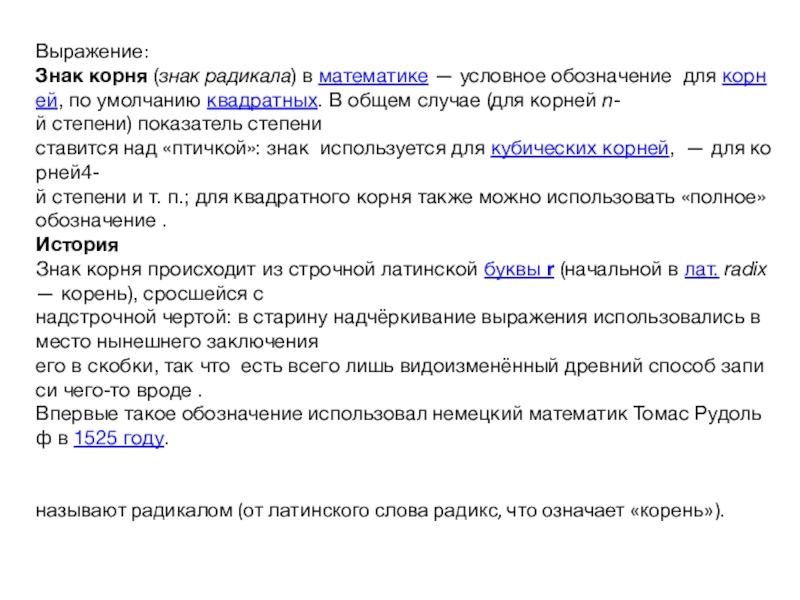 Выражение:Знак корня (знак радикала) в математике — условное обозначение  для корней, по умолчанию квадратных. В общем случае (для корней n-й степени) показатель степени ставится над «птичкой»: знак  используется для кубических корней,  — для корней4-й степени и т. п.; для квадратного корня также можно использовать «полное» обозначение .ИсторияЗнак корня происходит из строчной латинской буквы r (начальной в лат. radix — корень), сросшейся с надстрочной чертой: в старину надчёркивание выражения использовались вместо нынешнего заключения его в скобки, так что  есть всего лишь видоизменённый древний способ записи чего-то вроде .Впервые такое обозначение использовал немецкий математик Томас Рудольф в 1525 году.называют радикалом (от латинского слова радикс, что означает «корень»).