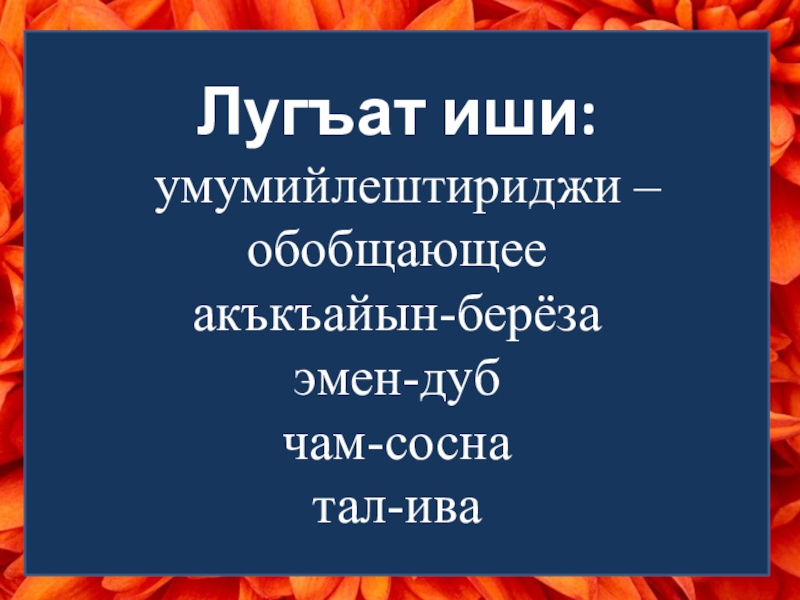 Лугъат иши: умумийлештириджи – обобщающееакъкъайын-берёзаэмен-дубчам-соснатал-ива