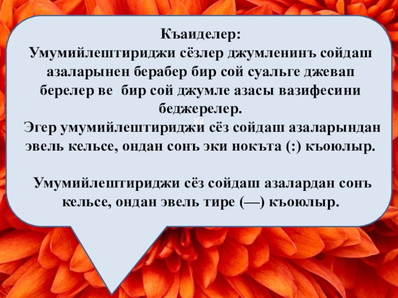КкКъаиделер:Умумийлештириджи сёзлер джумленинъ сойдаш азаларынен берабер бир сой суальге джевап берелер ве бир сой джумле азасы вазифесини