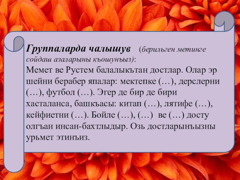 Слайд 3Группаларда чалышув (берильген метинге сойдаш азаларыны къошунъыз):
