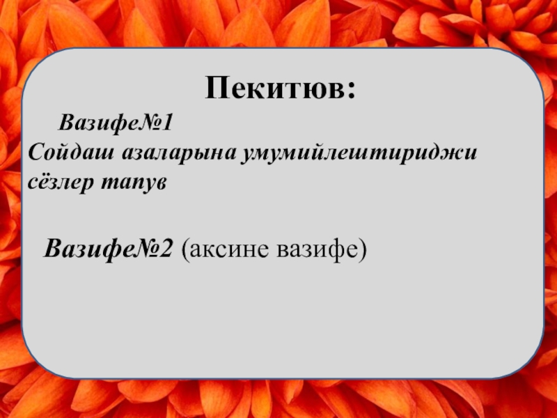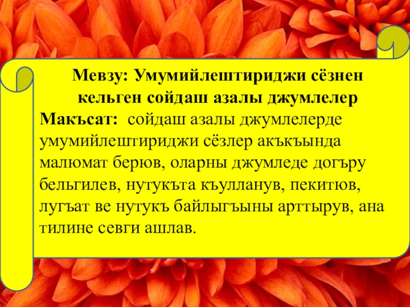Мевзу: Умумийлештириджи сёзнен кельген сойдаш азалы джумлелерМакъсат: сойдаш азалы джумлелерде умумийлештириджи сёзлер акъкъында малюмат берюв, оларны джумледе