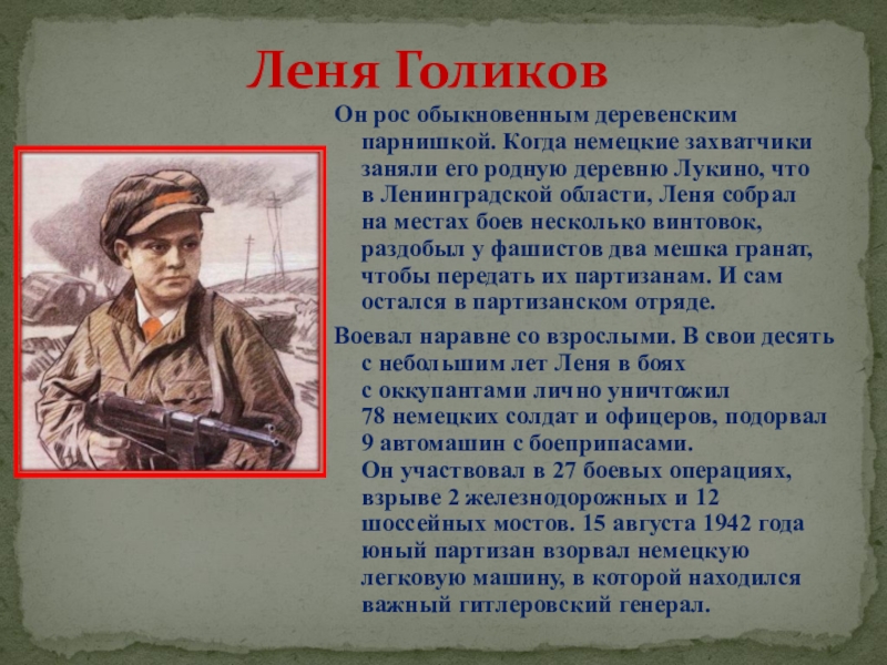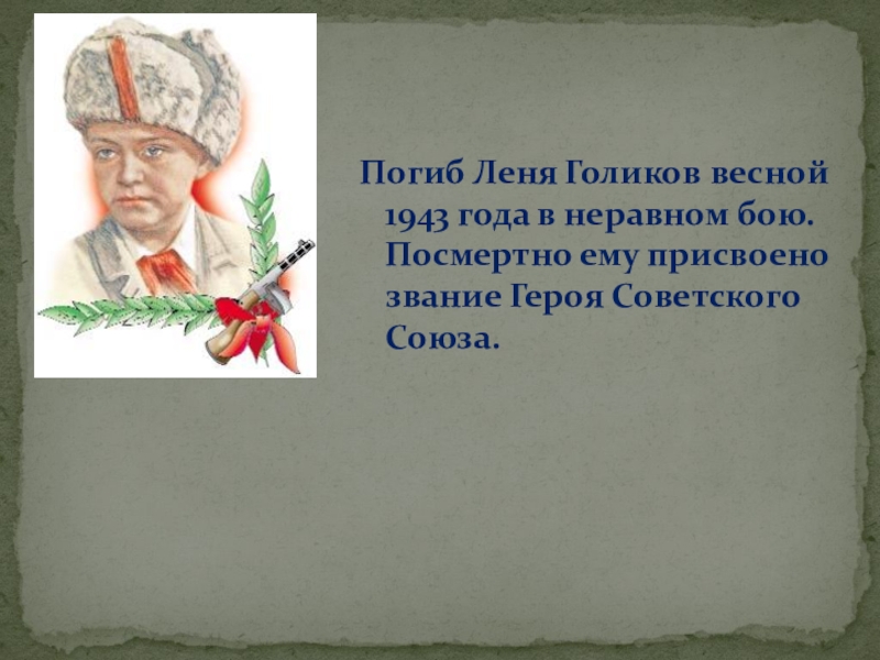 Слайд 11Погиб Леня Голиков весной 1943 года в неравном бою. Посмертно ему присвоено