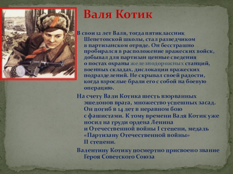 На счету Вали Котика шесть взорванных эшелонов врага, множество успешных засад. Он погиб в 14 лет в неравном бою с фашистами. К тому времени Валя Котик уже носил на груди ордена Ленина и Отечественной войны I степени, медаль «Партизану Отечественной войны» II степени.