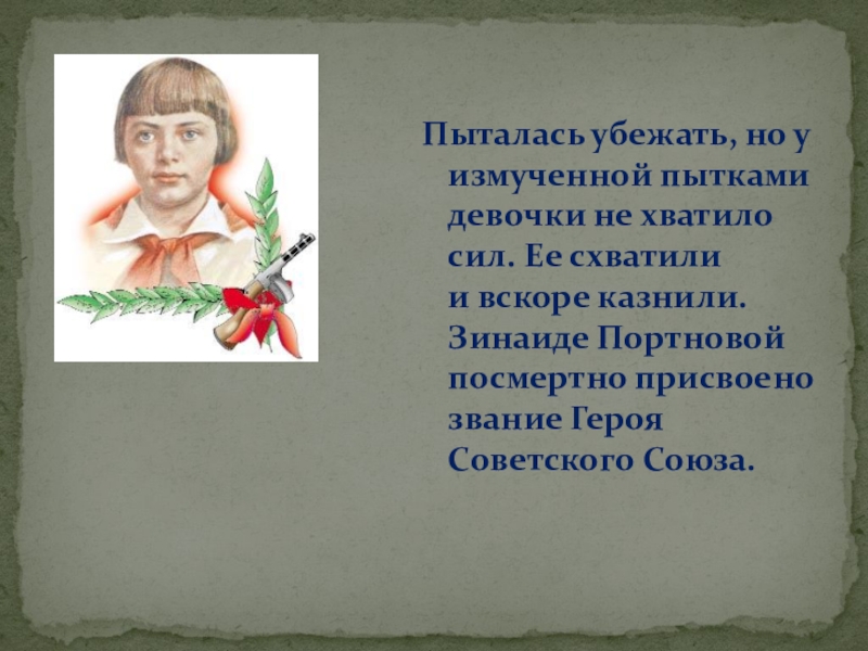 в Белоруссию. Там ее и застала война. Спустя несколько месяцев Зина вступила в подпольную организацию «Юные патриоты». Потом стала разведчицей в партизанском отряде имени Ворошилова. Девочка отличалась бесстрашием, смекалкой и никогда не унывала. Однажды ее арестовали.