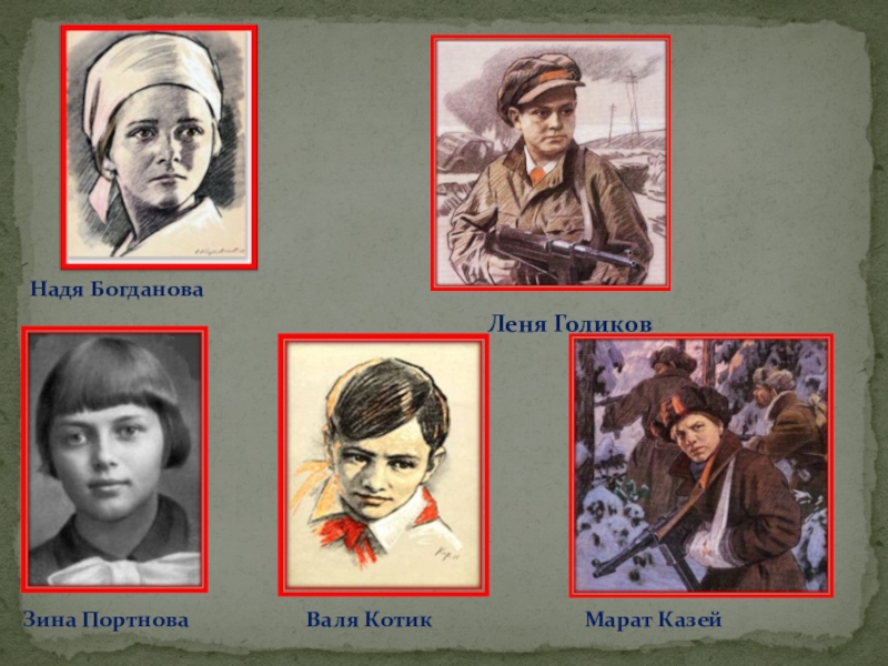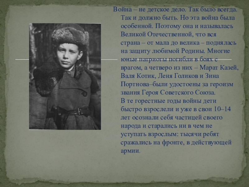 эта война была особенной. Поэтому она и называлась Великой Отечественной, что вся страна – от мала до велика – поднялась на защиту любимой Родины. Многие юные патриоты погибли в боях с врагом, а четверо из них – Марат Казей, Валя Котик, Леня Голиков и Зина Портнова–были удостоены за героизм звания Героя Советского Союза.