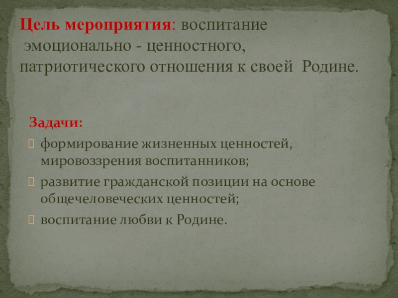 эмоционально - ценностного, патриотического отношения к своей Родине.