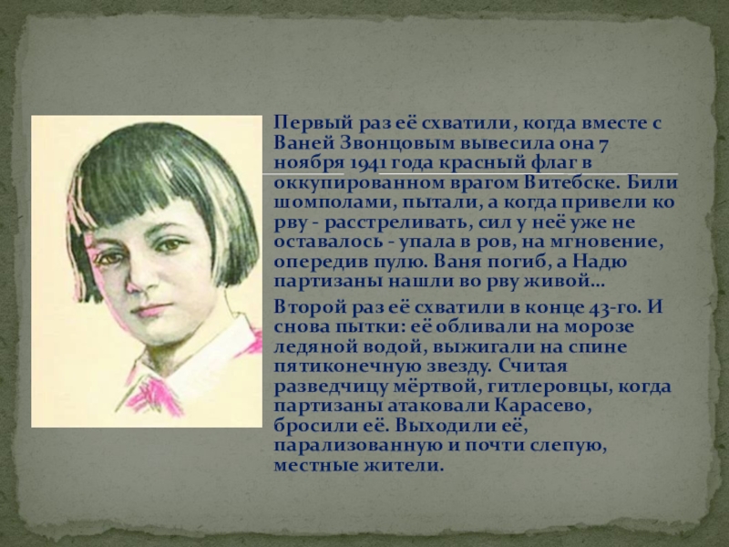 Слайд 9Первый раз её схватили, когда вместе с Ваней Звонцовым вывесила она