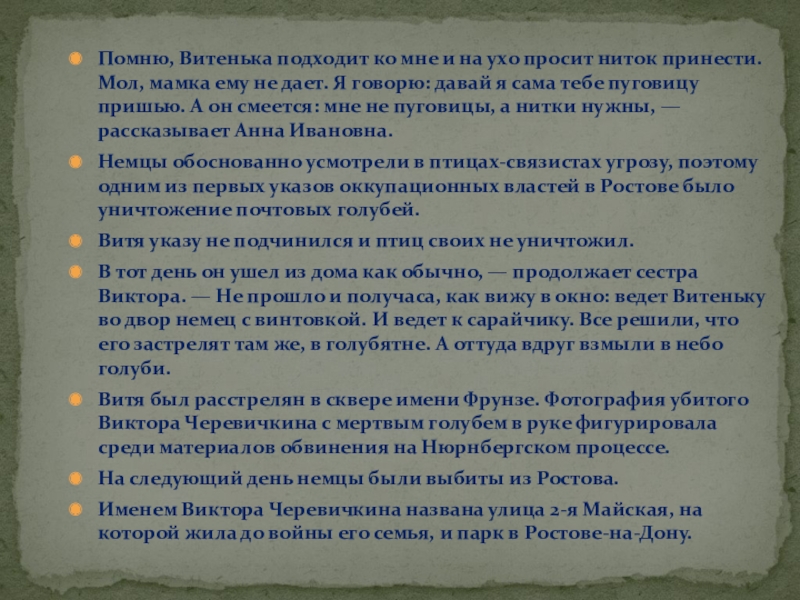 Витя стал связным у военных. Для того чтобы привязывать к лапкам голубей записки с данными, ему нужны были нитки. Нитки были дорогими, и найти в оккупированном городе их было непросто.