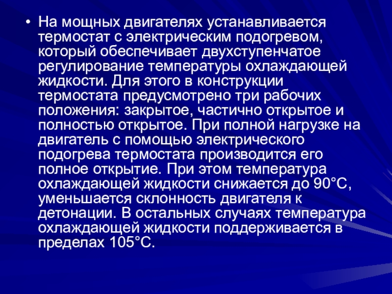 Слайд 17На мощных двигателях устанавливается термостат с электрическим подогревом, который обеспечивает двухступенчатое