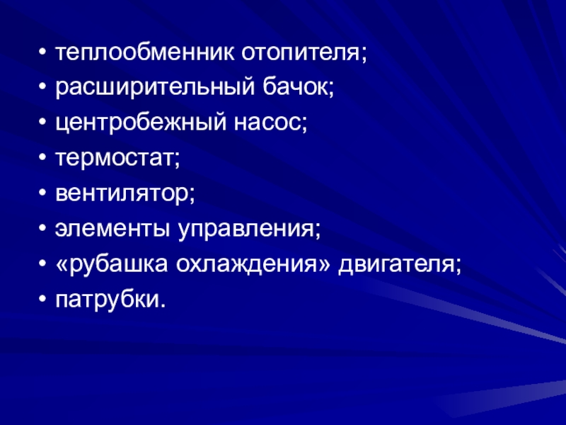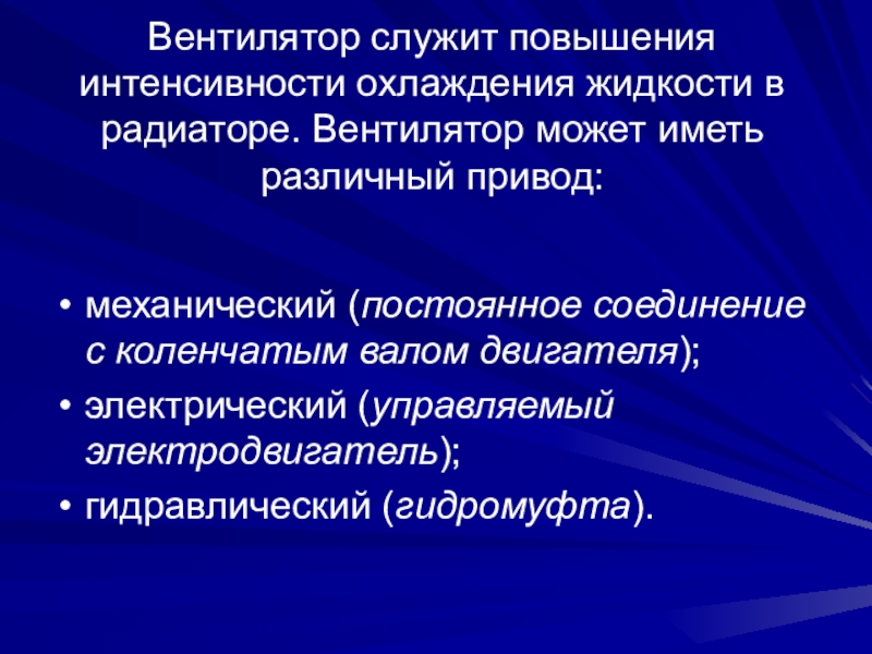 Слайд 18Вентилятор служит повышения интенсивности охлаждения жидкости в радиаторе. Вентилятор может иметь