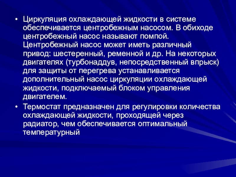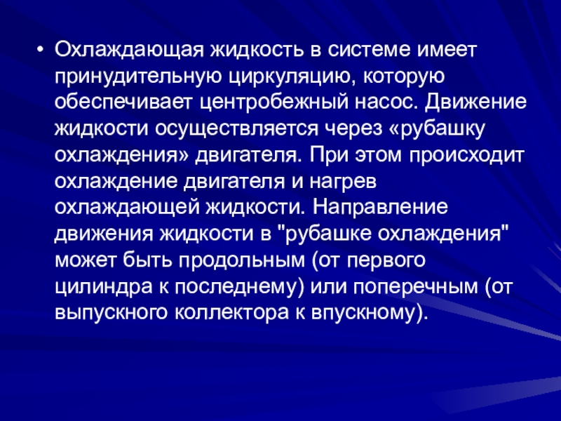 Слайд 24Охлаждающая жидкость в системе имеет принудительную циркуляцию, которую обеспечивает центробежный насос.