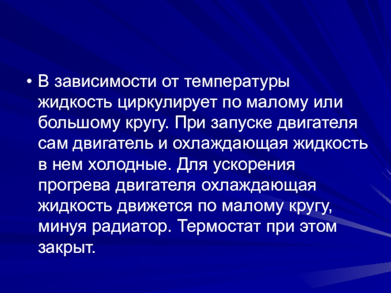 При запуске двигателя сам двигатель и охлаждающая жидкость в нем холодные. Для ускорения прогрева двигателя охлаждающая жидкость движется по малому кругу, минуя радиатор. Термостат при этом закрыт.