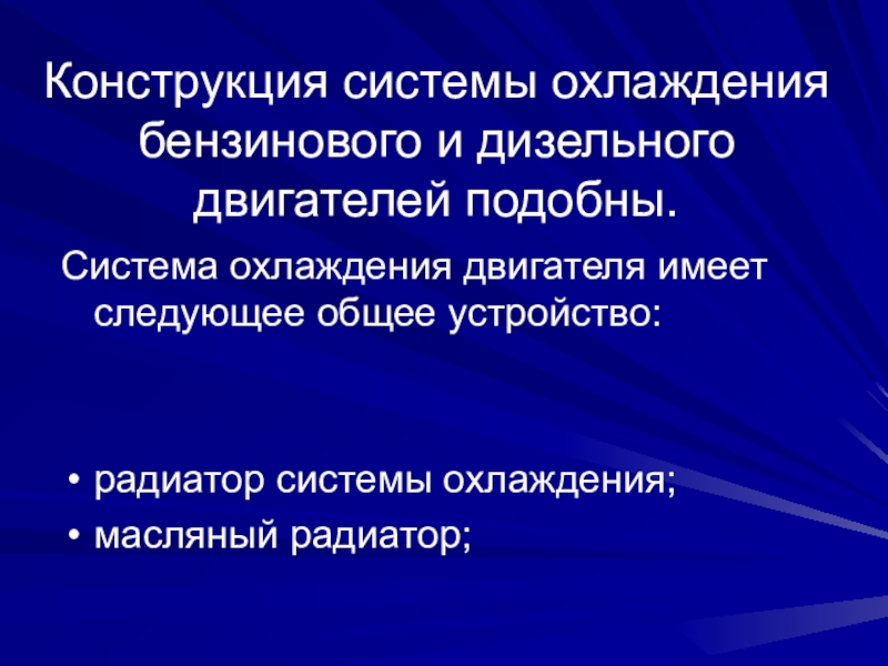 Слайд 7Конструкция системы охлаждения бензинового и дизельного двигателей подобны.