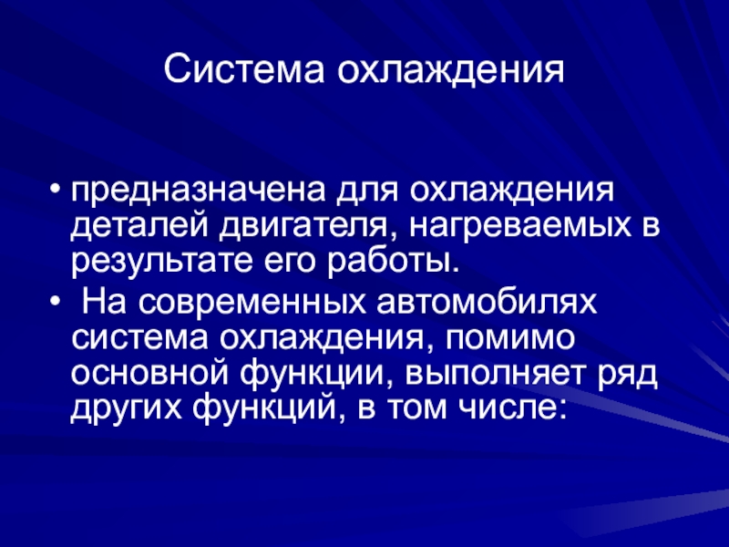 На современных автомобилях система охлаждения, помимо основной функции, выполняет ряд других функций, в том числе: