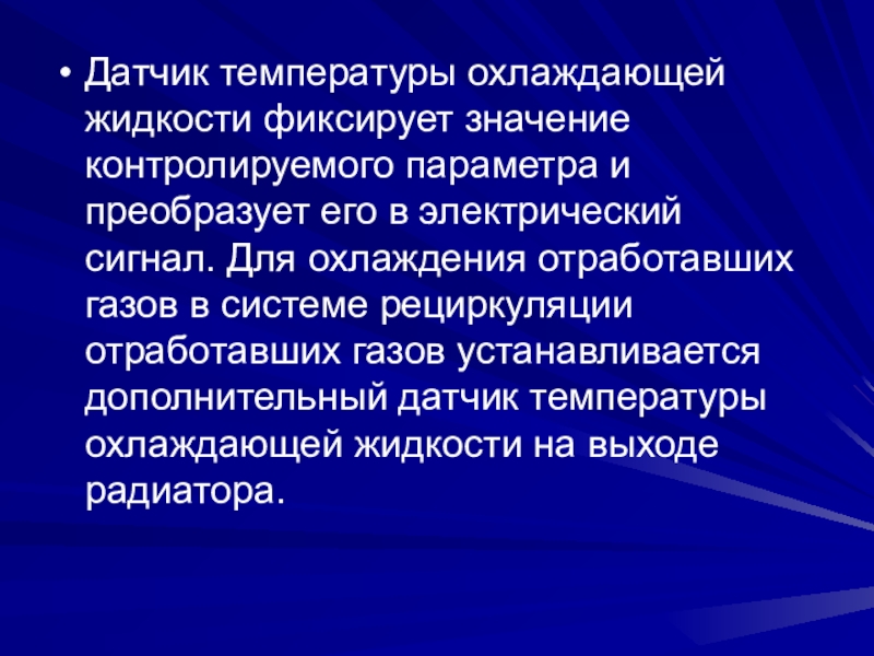 Слайд 20Датчик температуры охлаждающей жидкости фиксирует значение контролируемого параметра и преобразует его