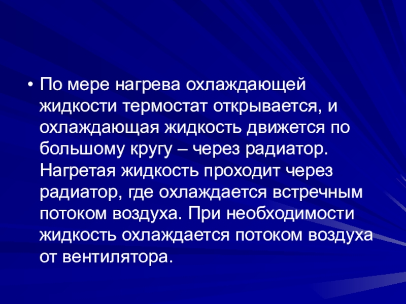 по большому кругу – через радиатор. Нагретая жидкость проходит через радиатор, где охлаждается встречным потоком воздуха. При необходимости жидкость охлаждается потоком воздуха от вентилятора.