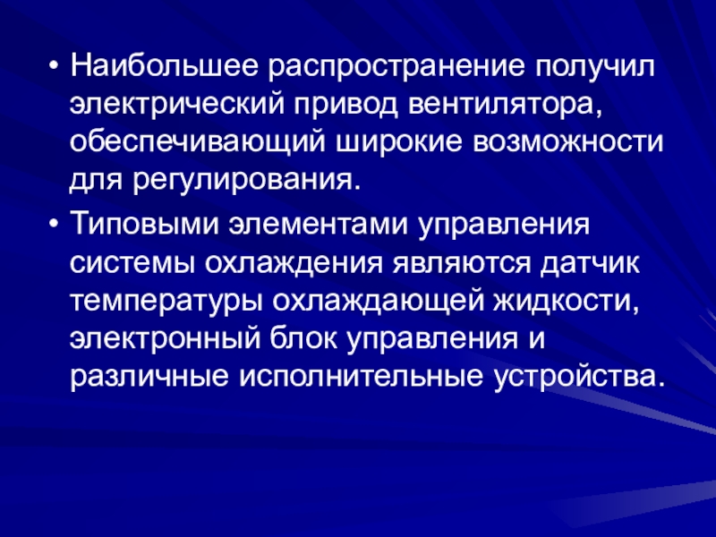 Слайд 19Наибольшее распространение получил электрический привод вентилятора, обеспечивающий широкие возможности для регулирования.