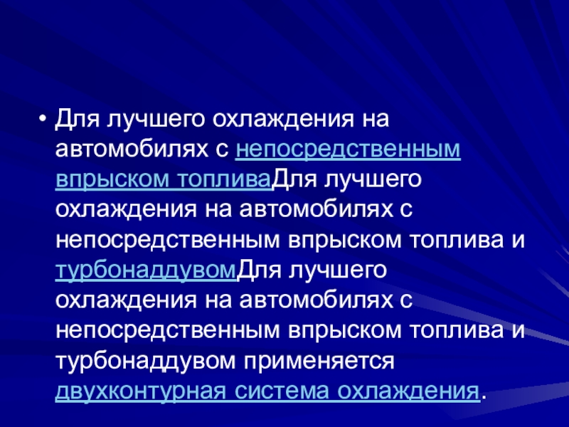 Слайд 28Для лучшего охлаждения на автомобилях c непосредственным впрыском топливаДля лучшего охлаждения