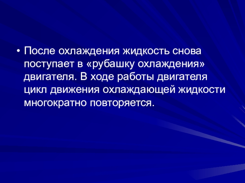 Слайд 27После охлаждения жидкость снова поступает в «рубашку охлаждения» двигателя. В ходе