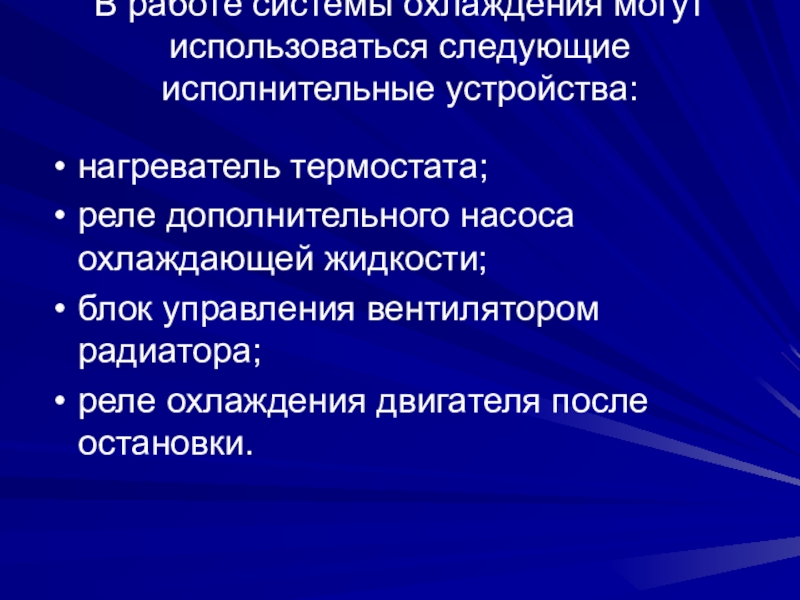 Слайд 22В работе системы охлаждения могут использоваться следующие исполнительные устройства: