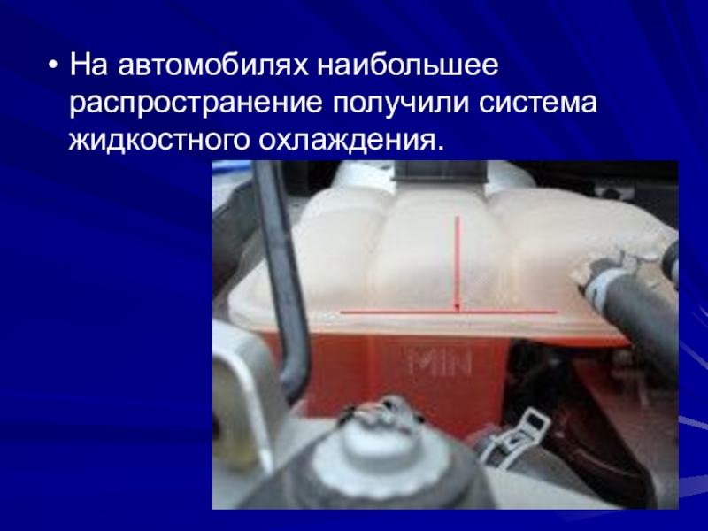 Слайд 5На автомобилях наибольшее распространение получили система жидкостного охлаждения.