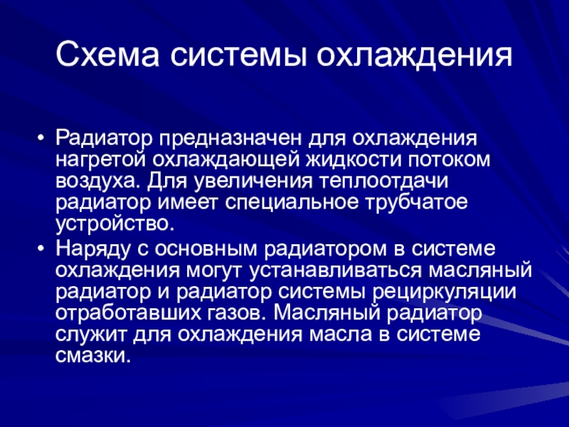 Наряду с основным радиатором в системе охлаждения могут устанавливаться масляный радиатор и радиатор системы рециркуляции отработавших газов. Масляный радиатор служит для охлаждения масла в системе смазки.
