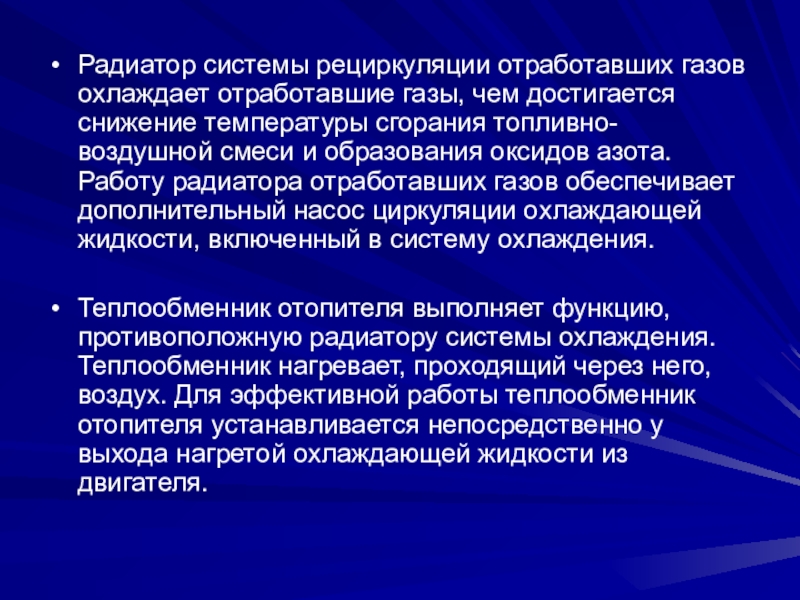 Слайд 13Радиатор системы рециркуляции отработавших газов охлаждает отработавшие газы, чем достигается снижение
