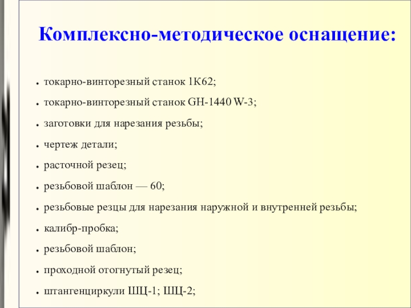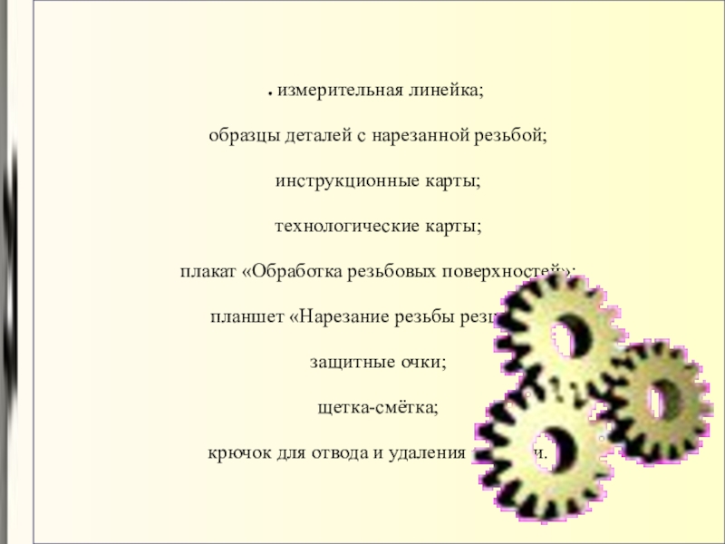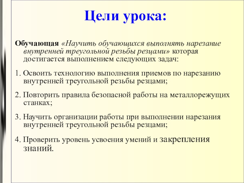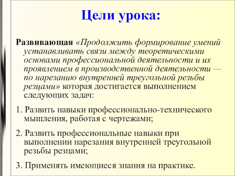 деятельности и их проявлением в производственной деятельности — по нарезанию внутренней треугольной резьбы резцами» которая достигается выполнением следующих задач: