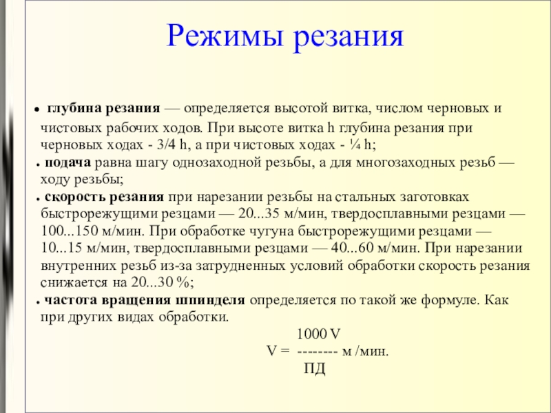 скорость резания при нарезании резьбы на стальных заготовках быстрорежущими резцами — 20...35 м/мин, твердосплавными резцами — 100...150 м/мин. При обработке чугуна быстрорежущими резцами — 10...15 м/мин, твердосплавными резцами — 40...60 м/мин. При нарезании внутренних резьб из-за затрудненных условий обработки скорость резания снижается на 20...30 %;