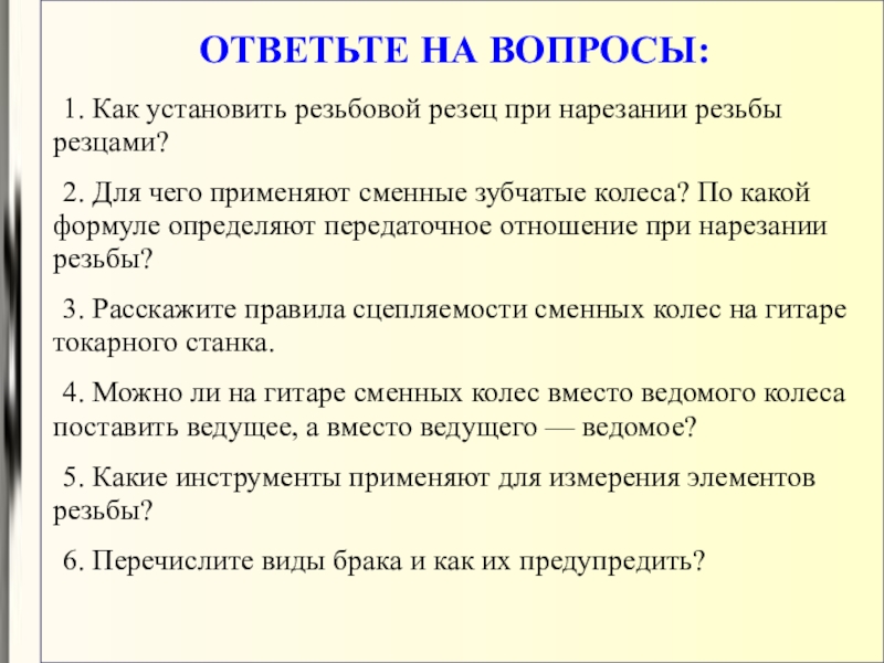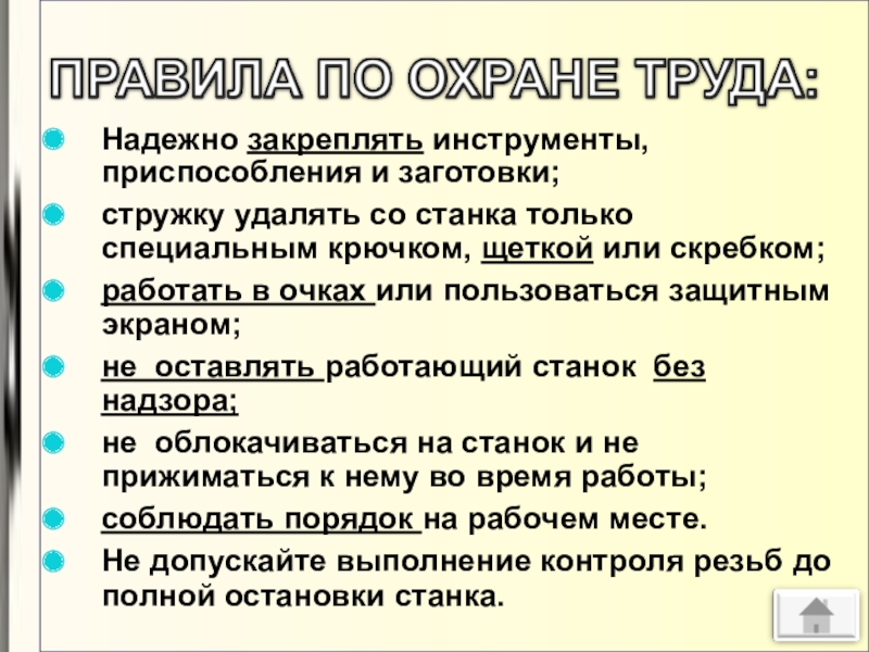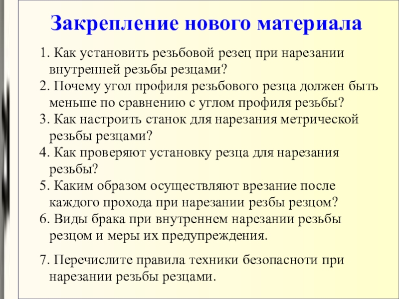 7. Перечислите правила техники безопасноти при нарезании резьбы резцами.