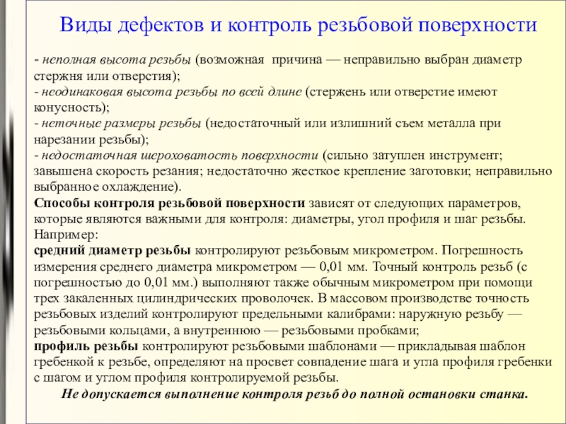 Не допускается выполнение контроля резьб до полной остановки станка.