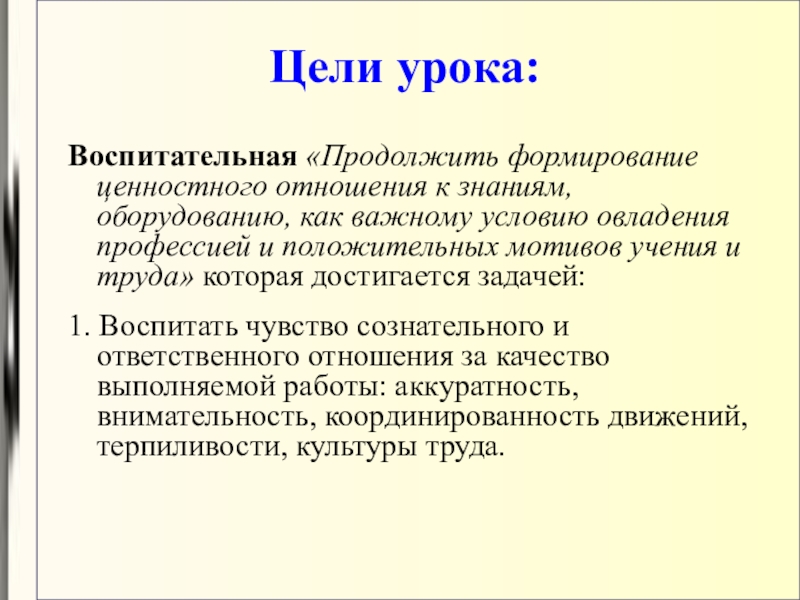 1. Воспитать чувство сознательного и ответственного отношения за качество выполняемой работы: аккуратность, внимательность, координированность движений, терпиливости, культуры труда.