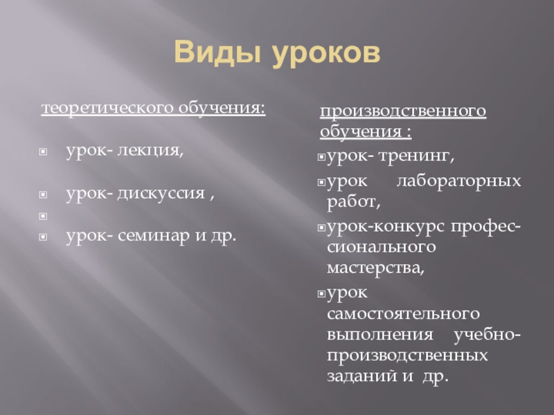урок самостоятельного выполнения учебно-производственных заданий и др.