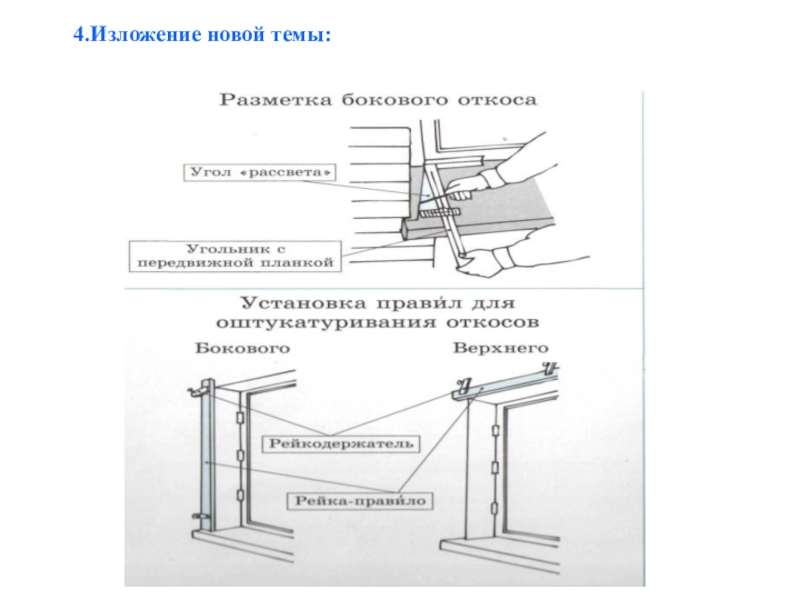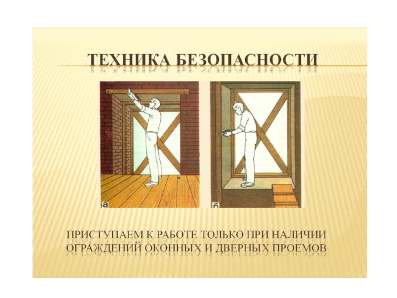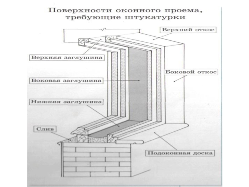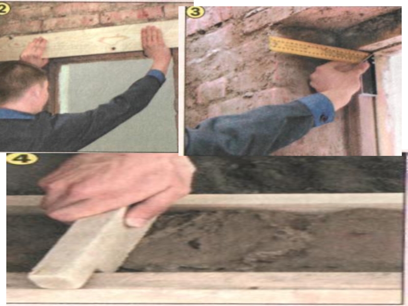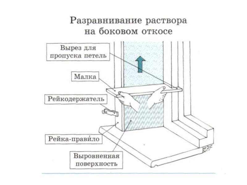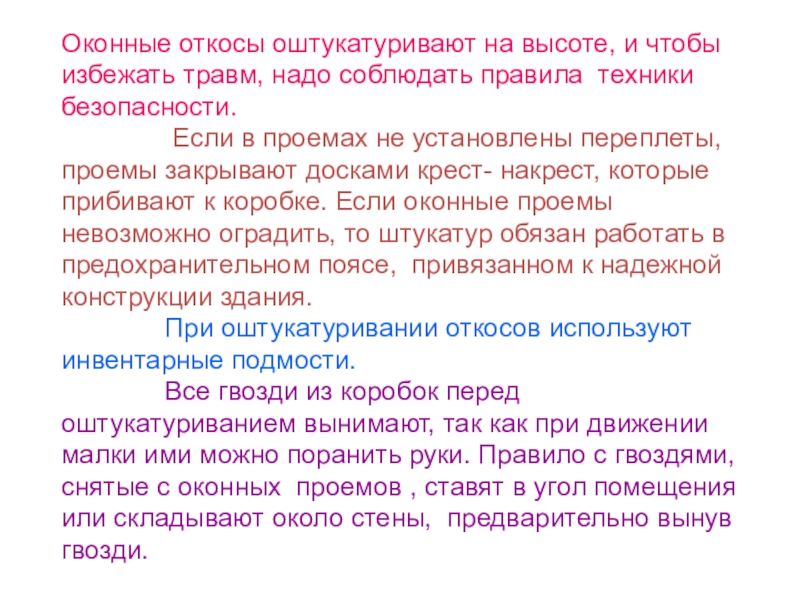 Слайд 20Оконные откосы оштукатуривают на высоте, и чтобы избежать травм, надо соблюдать