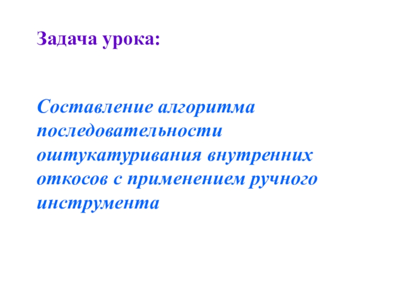 Составить алгоритм последовательности технологического процесса оштукатуривания внутренних откосов с учетом используемого иструмента, т.е. составить