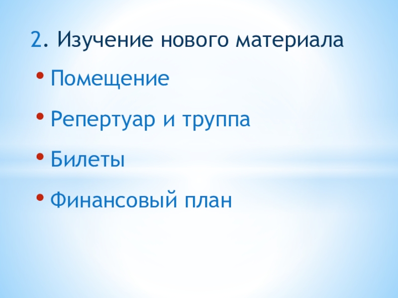 2. Изучение нового материалаПомещениеРепертуар и труппаБилетыФинансовый план