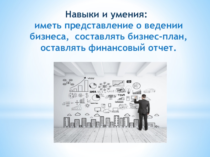 Слайд 4 Навыки и умения: иметь представление о ведении бизнеса, составлять бизнес-план,