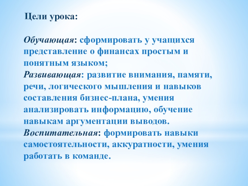 понятным языком; Развивающая: развитие внимания, памяти, речи, логического мышления и навыков составления бизнес-плана, умения анализировать информацию, обучение навыкам аргументации выводов. Воспитательная: формировать навыки самостоятельности, аккуратности, умения работать в команде.