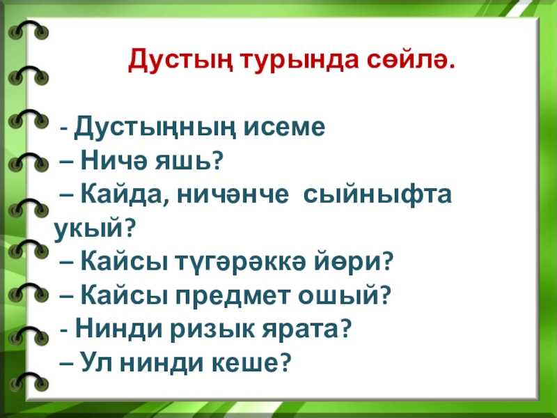 Дустың турында сөйлә. - Дустыңның исеме – Ничә яшь? – Кайда,