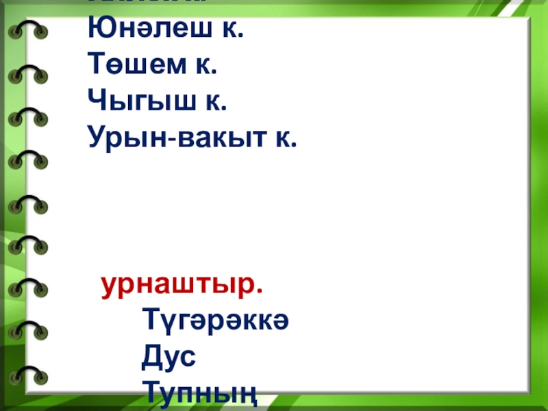 Сүзләрне дөресБаш к.Иялек к. Юнәлеш к.Төшем к.  Чыгыш к. Урын-вакыт к. урнаштыр.