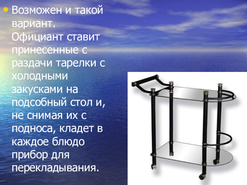 с холодными закусками на подсобный стол и, не снимая их с подноса, кладет в каждое блюдо прибор для перекладывания.