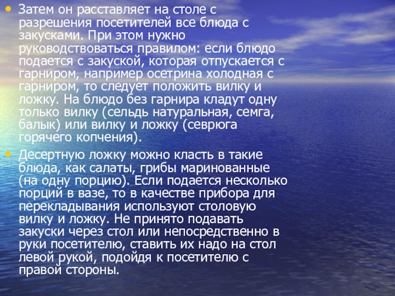 с закусками. При этом нужно руководствоваться правилом: если блюдо подается с закуской, которая отпускается с гарниром, например осетрина холодная с гарниром, то следует положить вилку и ложку. На блюдо без гарнира кладут одну только вилку (сельдь натуральная, семга, балык) или вилку и ложку (севрюга горячего копчения).