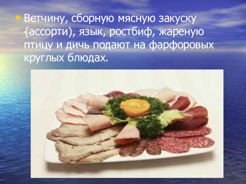 Ветчину, сборную мясную закуску {ассорти), язык, ростбиф, жареную птицу и