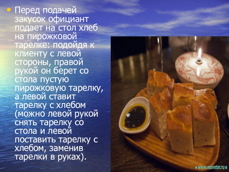 тарелке: подойдя к клиенту с левой стороны, правой рукой он берет со стола пустую пирожковую тарелку, а левой ставит тарелку с хлебом (можно левой рукой снять тарелку со стола и левой поставить тарелку с хлебом, заменив тарелки в руках).