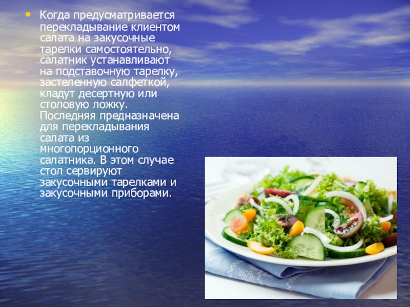 Когда предусматривается перекладывание клиентом салата на закусочные тарелки самостоятельно, салатник