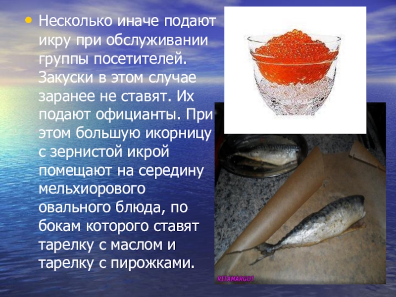Несколько иначе подают икру при обслуживании группы посетителей. Закуски в