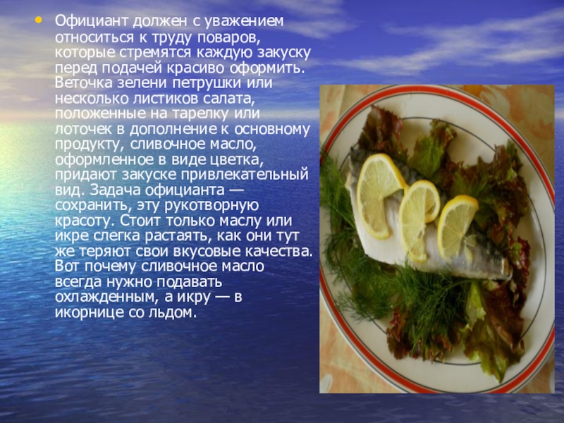 каждую закуску перед подачей красиво оформить. Веточка зелени петрушки или несколько листиков салата, положенные на тарелку или лоточек в дополнение к основному продукту, сливочное масло, оформленное в виде цветка, придают закуске привлекательный вид. Задача официанта — сохранить, эту рукотворную красоту. Стоит только маслу или икре слегка растаять, как они тут же теряют свои вкусовые качества. Вот почему сливочное масло всегда нужно подавать охлажденным, а икру — в икорнице со льдом.